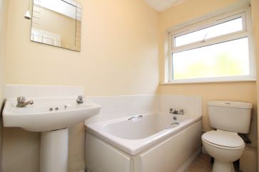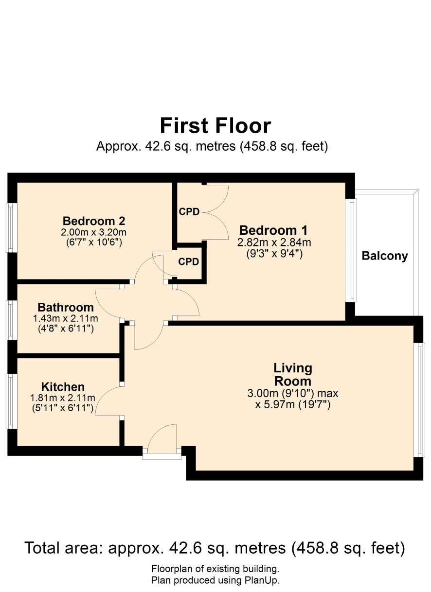 Ground Floor Private entrance with staircase serving this and one other flat. First Floor Living Room - 9'10" x 19'7" (3.00m x 5.97m) Features a full height window and door to a decked integral balcony, each looking over the gardens. Electric heater and ceiling coving. Kitchen - 5'11" x 6'11" (1.81m x 2.11m) Fitted cabinets have beech-effect fronts and granite-effect laminate worktops with splashback tiling and a single drainer sink. Fitted electric oven, hob and hood. Inner Hallway Bedroom One - 9'3" x 9'4" (2.82m x 2.84m) Includes a full height window to the balcony. Electric heater. Double cupboard including hot water cylinder. Bedroom Two - 6'7" x 10'6" (2.00m x 3.20m) Single built-in cupboard. Electric heater. Bathroom - 4'8" x 6'11" (1.43m x 2.11m) Fitted with a white three piece suite and splashback tiling.