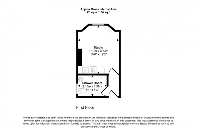 The property comprises a first floor studio flat situated within an end of terrace building arranging over ground and first floors.