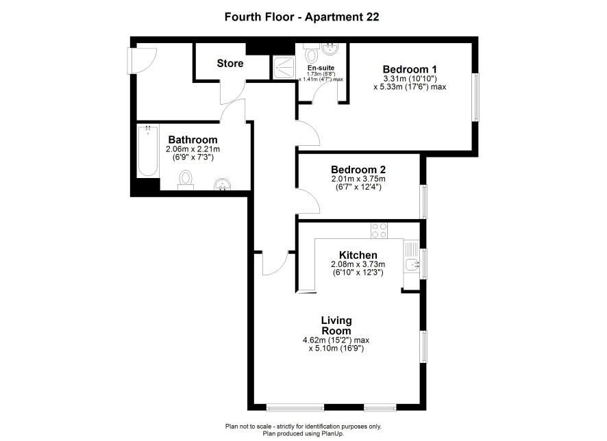 Living Room 15'2" Max x 16'9" (4.62m Max x 5.1m) Kitchen 6'10" x 12'4" (2.08m x 3.76m) Bedroom 1 10'10" x 17'6" Max (3.3m x 5.33m Max) En-Suite 5'8" x 4'8" Max (1.73m x 1.42m Max) Bedroom 2 6'7" x 12'4" (2m x 3.76m) Bathroom 6'9" x 2.21 (2.06m x 2.21)