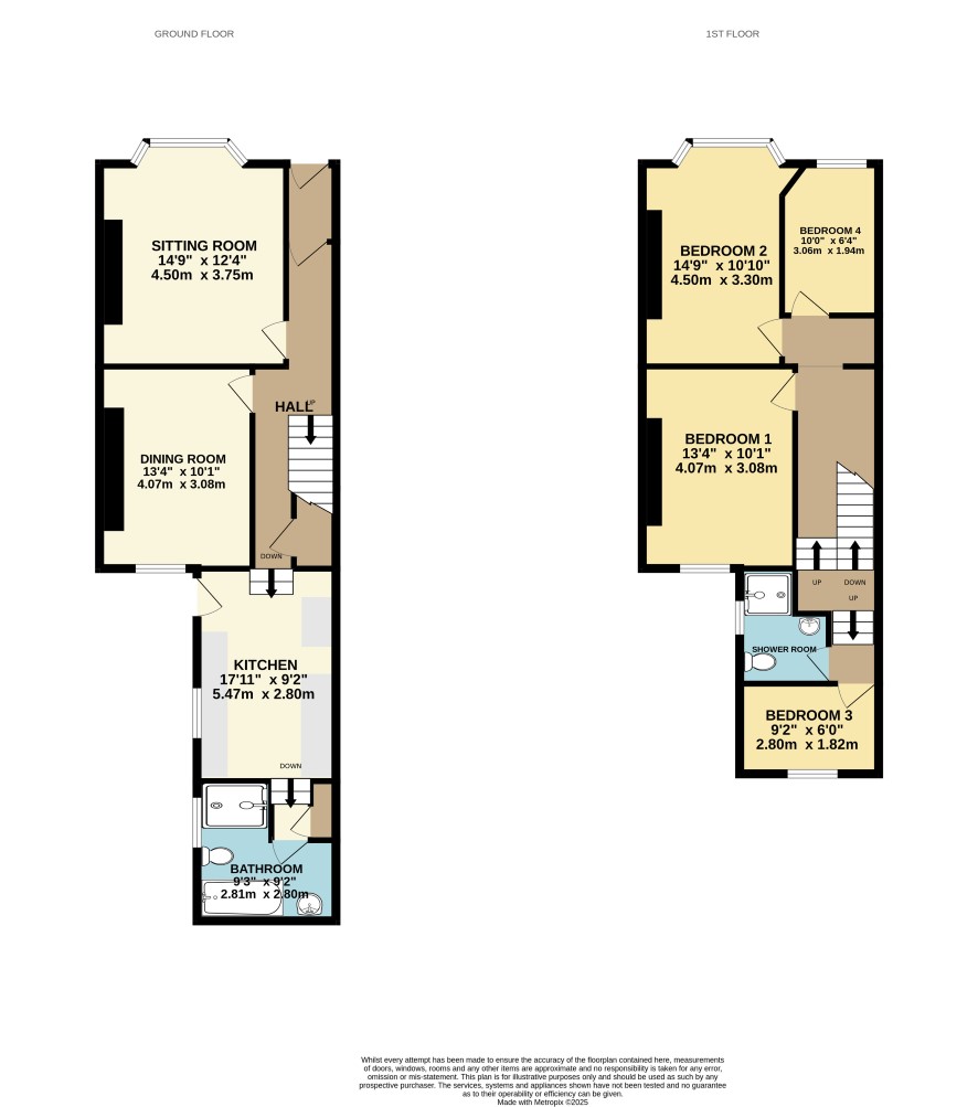 Hallway Sitting Room - 14'9" × 12'4" (4.50m × 3.75m) Dining Room - 13'4" × 10'1" (4.07m × 3.08m) Kitchen - 17'11" × 9'2" (5.47m × 2.80m) Bathroom - 9'3" × 9'2" (2.81m × 2.80m) Bedroom 1 - 13'4" × 10'1" (4.07m × 3.08m) Bedroom 2 - 14'9" × 10'10" (4.50m × 3.30m) Bedroom 3 - 9'2" × 6'0" (2.80m × 1.82m) Bedroom 4 - 10'0" × 6'4" (3.06m × 1.94m) Shower Room