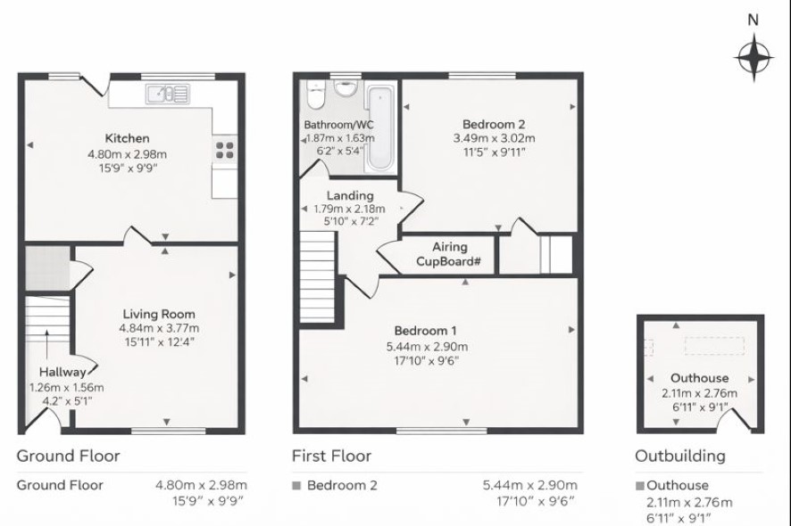 Living Room: 4.84m x 3.77m Kitchen: 4.80m x 2.98m Bedroom One: 5.44m x 2.90m Bedroom Two: 3.49m 3.02m Bathroom: 1.87m x 1.63m Outhouse: 2.11m x 2.76m