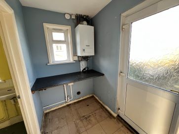 A vacant end terrace property in need of modernisation, comprising two double bedrooms, one single bedroom, living room, kitchen, utility room, W/C, and shower room. The property has PVCU double glazing, gas central heating, and a rear garden. Freehold.