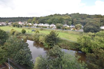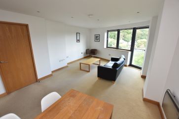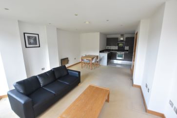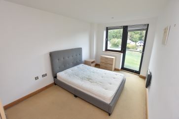 Open plan living space with modern fitted kitchen and Juliette balcony, master bedroom, house bathroom with three piece suite and shower over bath.